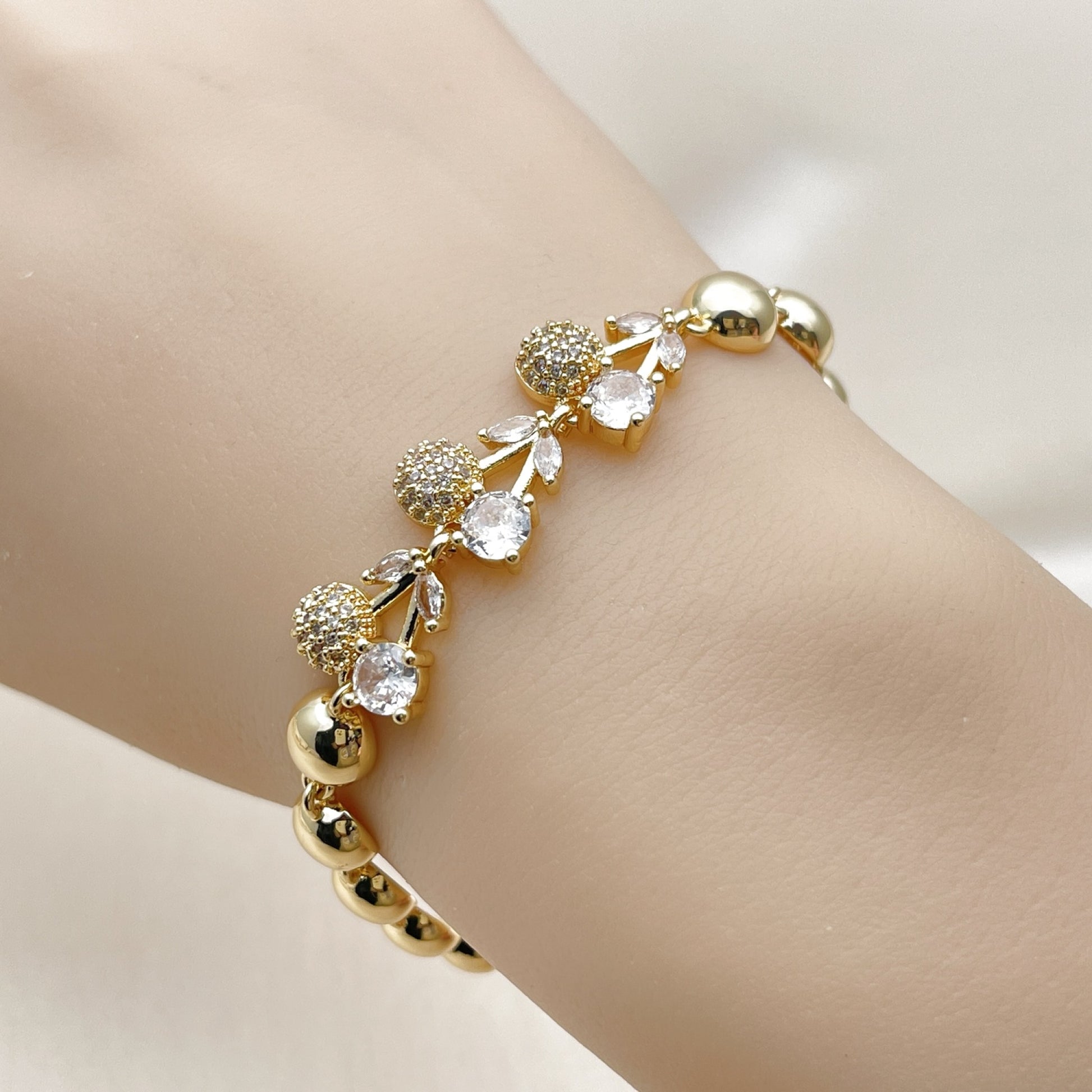 Oro Laminado Fancy Bracelet, Gold Filled Style Cherry and Ball Design, with White Cubic Zirconia and White Micro Pave, Polished, Golden