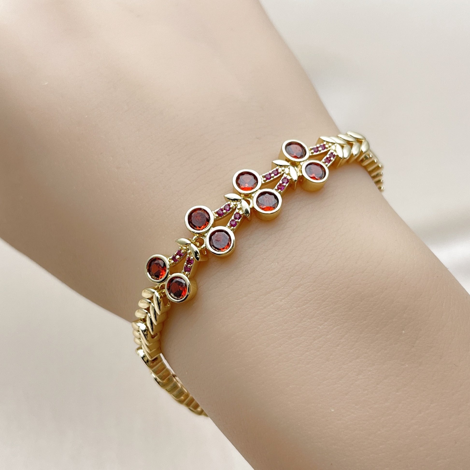 Oro Laminado Fancy Bracelet, Gold Filled Style Cherry Design, with White Cubic Zirconia and Ruby Micro Pave, Polished, Golden