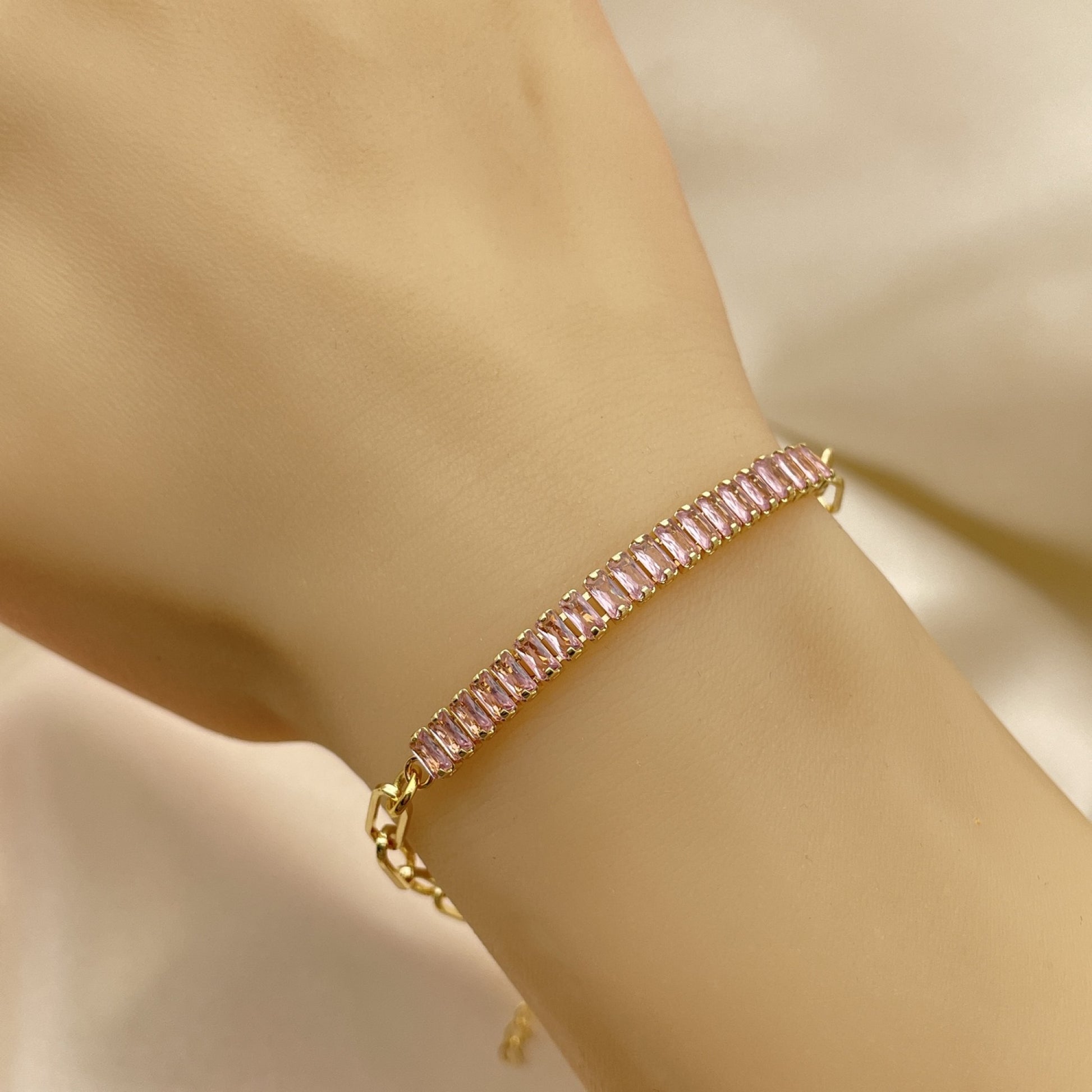 Oro Laminado Fancy Bracelet, Gold Filled Style Paperclip Design, with Pink Cubic Zirconia, Polished, Golden Finish